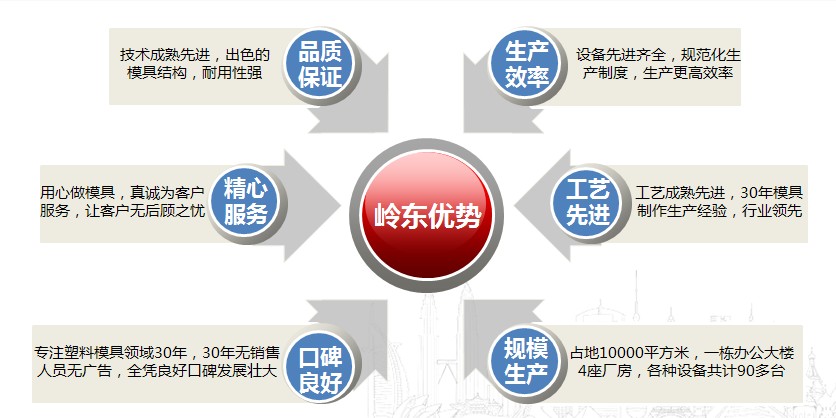 揭陽嶺東模具有限公司創(chuàng)建于1986年,歷時20多年穩(wěn)健發(fā)展,廠區(qū)占地面積10000平方米,工人技術人員近百人,是一個技術力量雄厚、設備先進、工人經(jīng)驗豐富的大型民營塑料模具制造企業(yè)。公司擁有寬敞明亮的現(xiàn)代化標準廠房及各種先進的加工設備,其中日本哈馬伊加工中心、臺灣進口加工中心、大型龍門銑床及各種立式、臥式數(shù)控銑床共31臺,數(shù)控車床15臺,數(shù)控線切割機、數(shù)控電火花成型機、鉆床、磨床及鋸床共計32臺,大小型起重機、航車15臺。自主研發(fā)模具生產(chǎn)工藝及模具成型技術,特別對于制造加工大中型日用塑料模具具有極大優(yōu)勢。